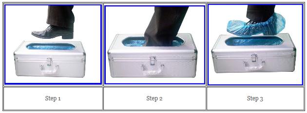 使用方法:首先由人工将鞋套安装进鞋套机内,使用时只需要使用者抬脚在鞋套机内轻轻踩踏一下,就会有一只鞋套套到脚上,简单方便.