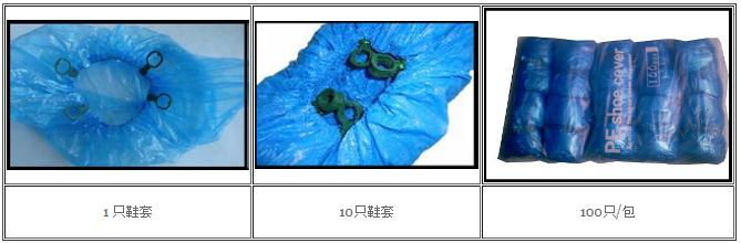 材料及数量:鞋套分普通PE鞋套,根据厚度不同分为2.5克,3.0克和3.8克三种。